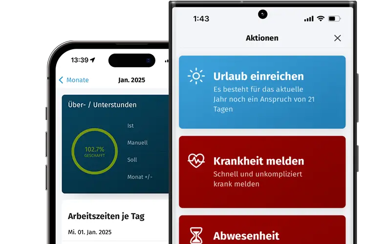 - Abwesenheiten verwalten (z. B. Krankmeldung, Überstundenabbau) direkt in der App